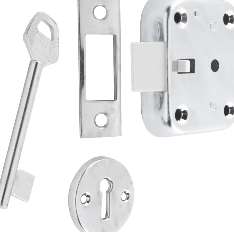 Kaappilukko kaapin oville. 87 mm pitkä avain yhdistelmällä ja symmetrinen rakenne, joka sopii sekä oikean- että vasemmanpuoleisiin oviin.