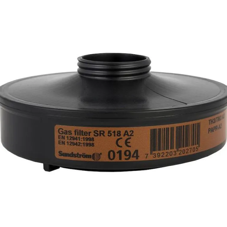 Kaasuilta ja höyryiltä suojaava suodatin, jossa on optimoitu imeytyminen. SR 518 A2 -kaasusuodatin on tarkoitettu käytettäväksi SR 500-/SR 500 EX -puhaltimessa. Suojaa orgaanisilta kaasuilta ja höyryiltä, kuten liuottimilta, joiden kiehumispiste > +65 °C. SR 500-/SR 500 EX -puhallinyksikköä on käytettävä aina kahden hiukkassuodattimen tai kaasu- ja hiukkassuodattimista koostuvan yhdistelmäsuodattimen kanssa.