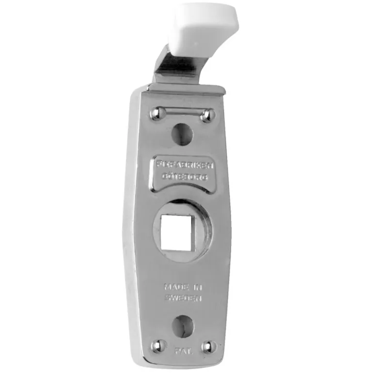 Kahvalukko, jossa on kromattu zamak-metallikotelo. Valkoinen muovinen sormenkahva. Muut osat karkaistua kiiltosinkittyä terästä.