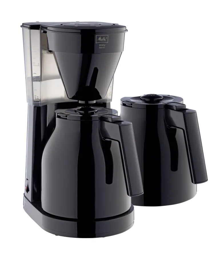 Melitta Easy 2.0 Therm on 1080 W:n kahvinkeitin, jossa on käytännöllinen eristetty kannu ja moderni muotoilu. Vedellä täytettäessä vesisäiliön etupuolelta on helppo nähdä vedenpinta. Eristetty kannu, jossa on keittokansi ja yksinkertainen napsautustoiminto, pitää kahvin lämpimänä pitkään ja on erittäin helppo käyttää yhdellä kädellä. Kahvinkeittimen mukana tulee ylimääräinen termoskannu.