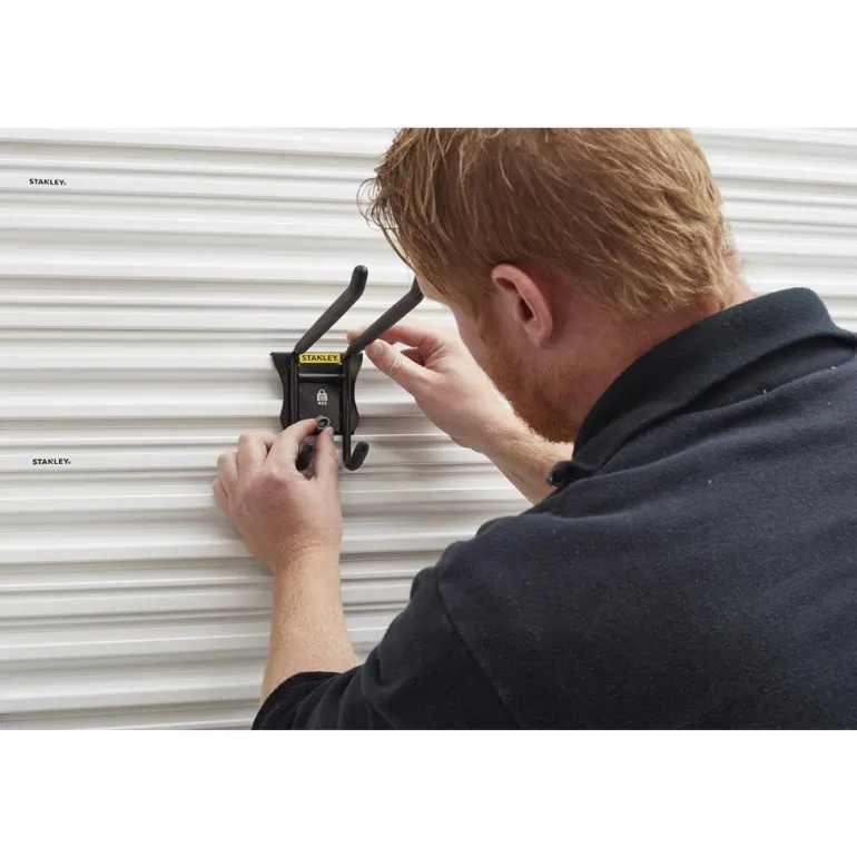 Kaksoiskoukku seinäkiskoon. STANLEY® Track Wall System -kiskoon asennettava kaksoiskoukku sopii monille erilaisille työkaluille, kuten trimmereille, lehtipuhaltimille, haravoille, lapioille jne. Maksimoi autotallisi tilavuus. Kaksi pitkää koukkua kahden lyhyen koukun yläpuolella mahdollistavat monien erilaisten työkalujen säilyttämisen ja kaksinkertaistavat säilytysmahdollisuudet. Helppo asentaa STANLEY® Track Wall System -kiskoihin ilman työkaluja. Koukku lukittuu varmasti paikoilleen vääntö- ja lukitusmekanismilla. Vahva teräskoukku on pinnoitettu liukumattomalla materiaalilla, joka ehkäisee naarmuja ja ruostevaurioita sekä pitää työkalut ja varusteet paremmin paikoillaan. Kantavuus jopa 11,4 kg. Yhden koukun koko 9 x 26,5 x 15 cm.