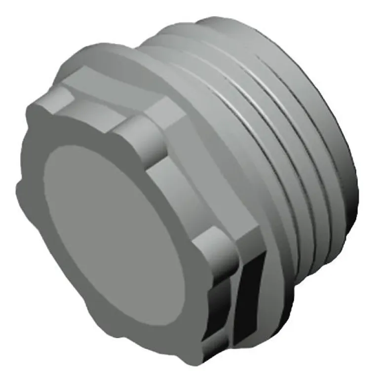 Harmaa kalvotulppa polypropeenia. Varustettu RAL7035:n mukaisesti joustavalla lämpömuovista valmistetulla kalvolla. Varustettu metrikokoisella kierteellä. Halogeeniton. Lämpötila-alue -40°C – +80°C.
