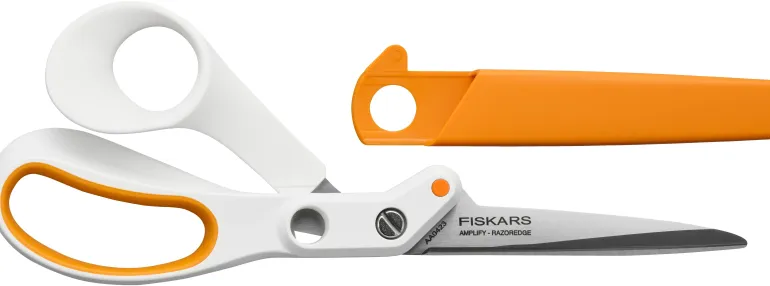 Fiskars Amplify™ -kangassaksien innovatiivisen teknologian, kätevien ominaisuuksien ja ergonomian ansiosta paksujenkin kankaiden ja kangaskerrosten leikkaaminen onnistuu siististi. Huipputerävät RazorEdge-terät takaavat siistin leikkuujäljen koko terän pituudelta kankaita leikatessa. Ergonomisesti muotoiltu kahva mukailee käden muotoja, ja Softgrip™-yksityiskohdat lisäävät käyttömukavuutta ja hallinnan tuntua.