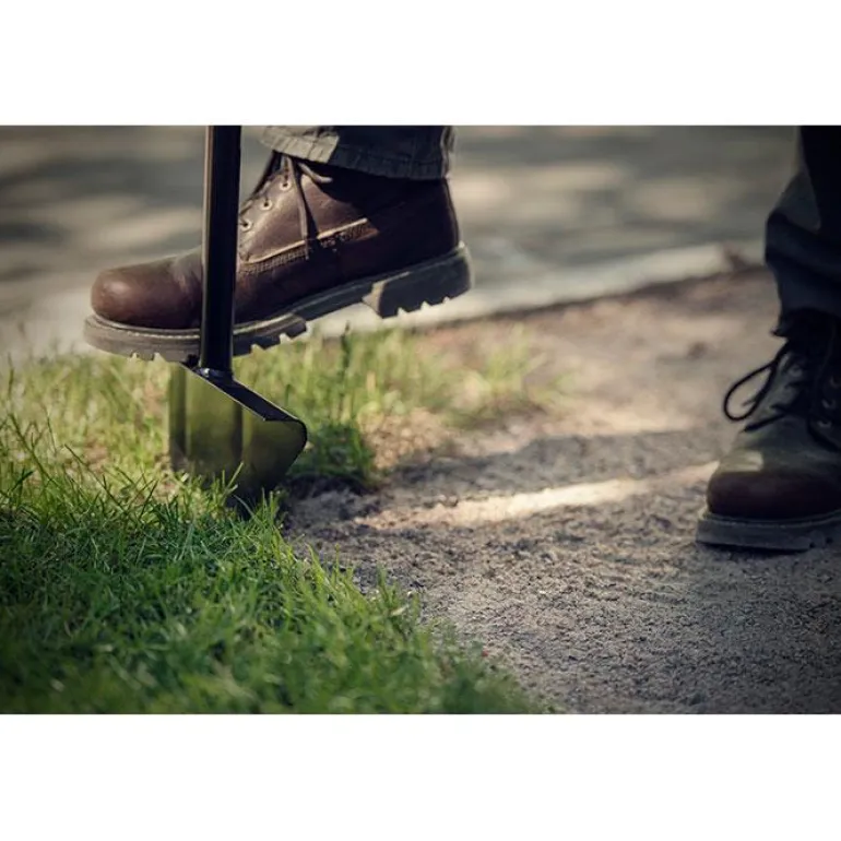 Kanttausraudan terä on suorakulmainen ja terävä, jolla saa tehokkaasti nurmikon reunat siistittyä. Kanttausraudan T-muotoinen kädensija helpottaa työskentelyä.