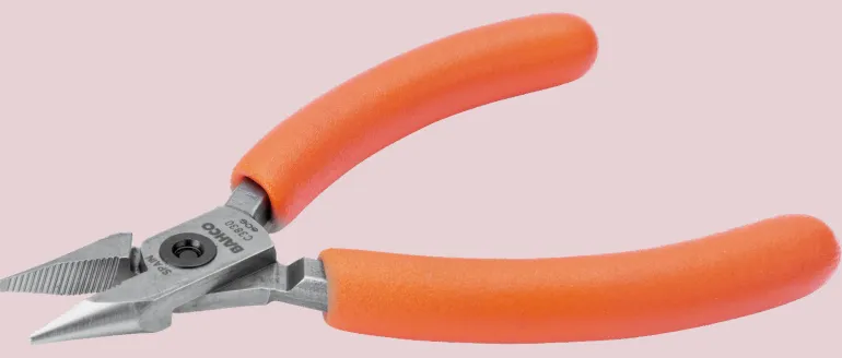 Kärkipihdit oransseilla PVC-kahvoilla ja hammastetuilla leuoilla. Kitkaa vähentävä ja leikkuupinnat suorana pitävä ruuviliitos. Sisäinen palautusjousi rajoitetulla avaumalla estää käyttäjän käden väsymisen. Erikoisterästä, käsittelemätön pinta. CNC-konehionta varmistaa särmäkulman tarkkuuden. ISO 9655.