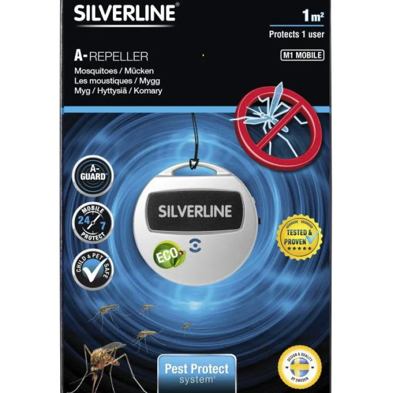 Silverline Myggfritt on paristokäyttöinen elektroninen karkotin, joka karkottaa hyttyset. Myggfritt-karkotin pitää naarashyttyset loitolla täysin myrkyttömästi hyödyntämällä Silverline A-Guard -ääniteknologiaa. Toimitus sisältää yhden LR44H-pariston.