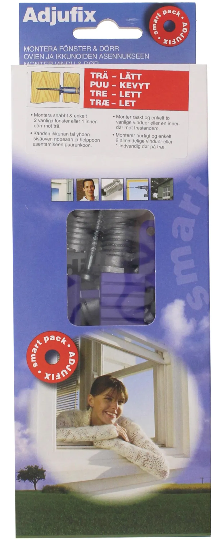 Puu – Kevyt. Asennettaessa 2 tavallista ikkunaa tai 1 sisäovi puuta vasten. Sisältää 8 kiinnityspisteen holkit, ruuvit ja suojukset.