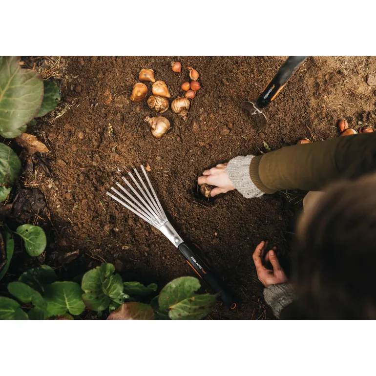 Täydellisesti tasapainotettu käsiharava ruostumatonta terästä. FiberComp-kahva.