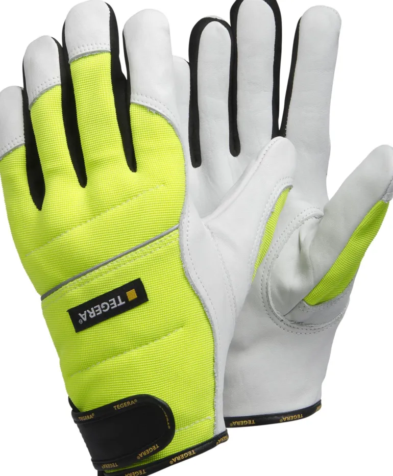 Kuvaus: Vahvike etusormessa, huomioväri, vahvikkeet sormenpäissä, nivelletyt sormet, moottorisahasuoja sekä oikeassa että vasemmassa kädessä