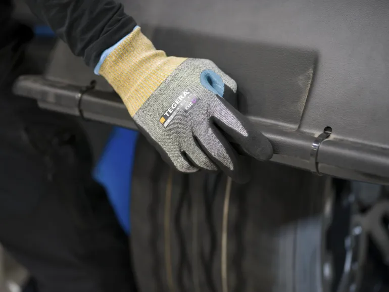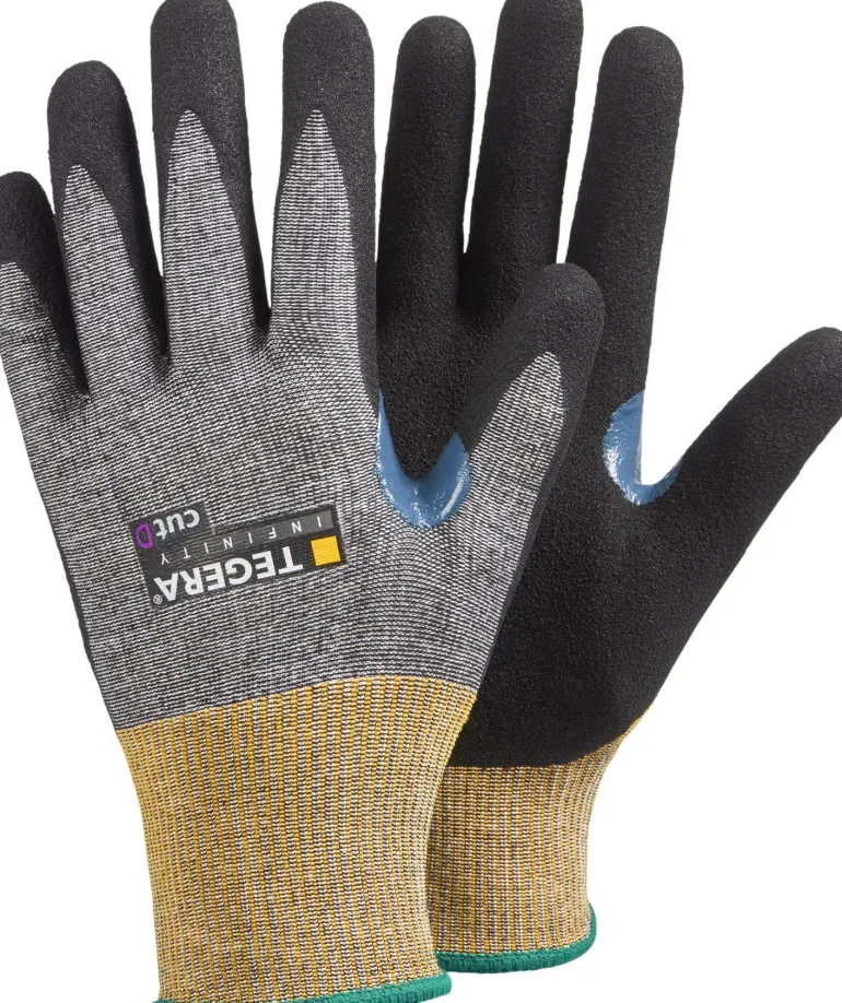 Kuvaus: Anatomisesti muotoiltu, hyväksytty elintarvikekäyttöön, kestää kosketuslämpöä jopa 100°c saakka, viiltosuoja EN 388:2016 tason D mukaan