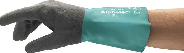 - AlphaTec® 58-270 on nestetiivis käsine. Ranneosan turvallinen muotoilu estää repeytymisen ja paljaan ihon kutinan.