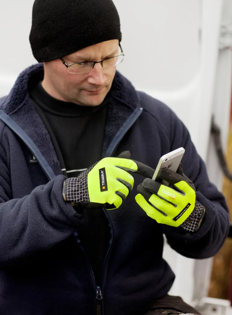 Kuvaus: Ergonomisesti muotoiltu, heijastin, kosketusnäytöille, lyhyt malli, ei sisällä kromia, vahvike etusormessa, huomioväri, vahvistetut saumat, yksityiskohtainen suunnittelu, vahvikkeet sormenpäissä, nivelletyt sormet, erikoissuunniteltu peukalo-osa