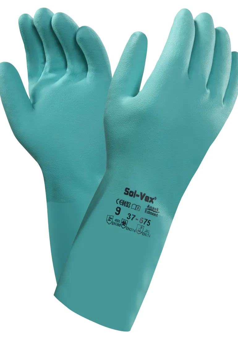 Ansell Solvex Plus 37-675 on täysin uudelleenkäytettävä koon 8 nitriilikäsine. Käsineen käyttömukavuus ja hankauksenkesto ovat vertaansa vailla. Sol-Vex®-nitriilikäsineet ovat ihanteellinen valinta vahvojen kemikaalien turvalliseen käsittelyyn monissa erilaisissa työympäristöissä. Pehmeä puuvillanukkavuori takaa jatkuvan erinomaisen käyttömukavuuden yhdessä joustavan nitriilikalvon kanssa.