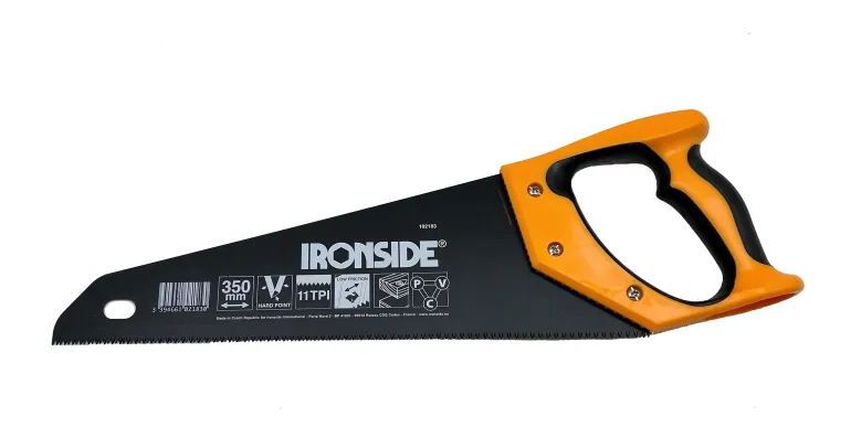 Ironside 102183 on hienohampainen ja kärkikarkaistu käsisaha. Lyhyen mallinen yleissaha, joka sopii hyvin työkalupakkiin. Ergonominen kaksikomponenttikahva 45° ja 90° kulmilla.