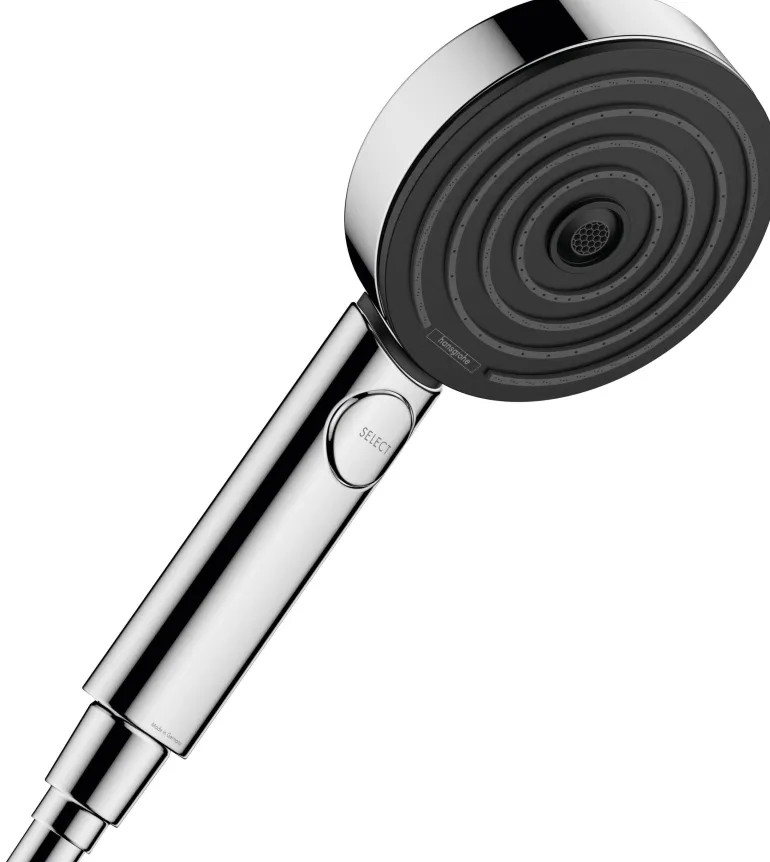 Hansgrohe Pulsify Select S -käsisuihku, jonka suihkupään koko 105 mm. Suihkutyypit: PowderRain, IntenseRain, MonoRain. Kätevä suihkutyypin vaihto Select-painikkeella, maksimivirtaama 3 baarin paineella 6,9 l/min.