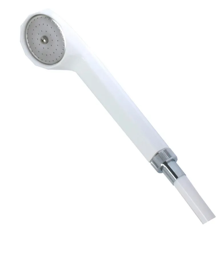 Valkoinen käsisuihku, valmistettu muovista, mukana kromattu siivilä ruostumatonta terästä. Suihkussa on yksi suihkutyyppi ja G15-liitäntä.
