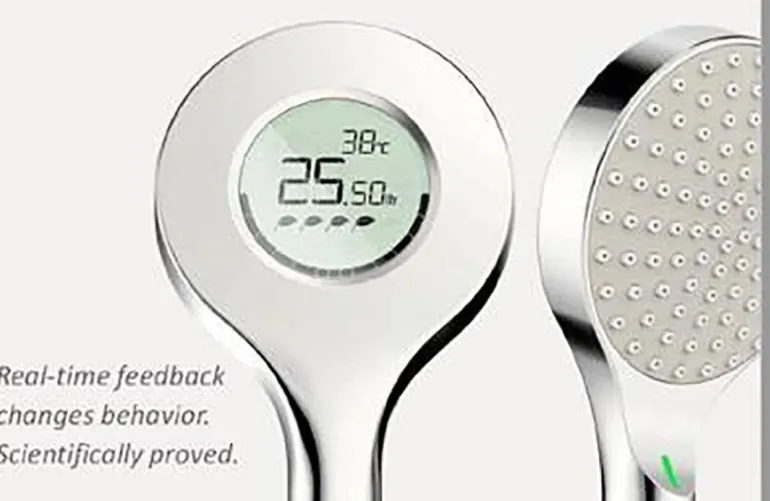 Digitaalinen, oman energiansa tuottava käsisuihku bluetooth-liitännällä Oras App -sovelluksen kautta – näyttää todellisen kulutuksen suoraan käsisuihkun näytöltä – vettä ja energiaa säästävä.