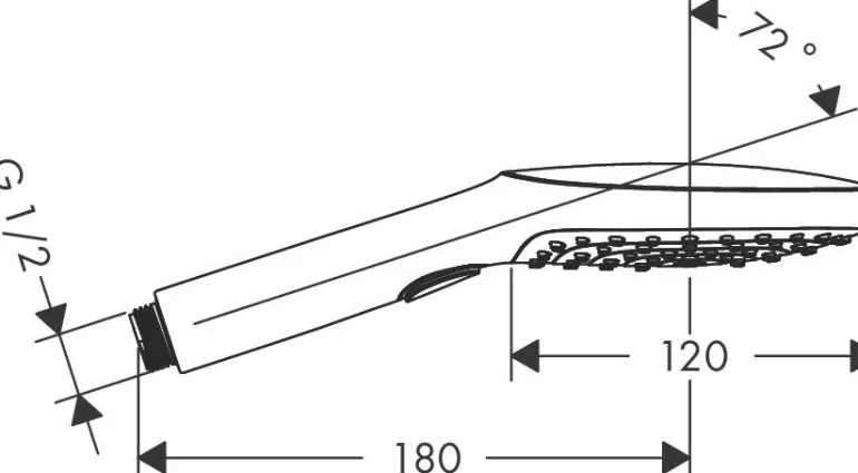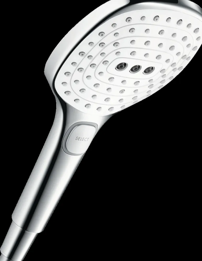 Hansgrohe Raindance Select E120 3jet -käsisuihku, jonka suihkupään koko 120 mm. Kätevä suihkutyypin vaihto Select-painikkeella (RainAir, Rain, Whirl).