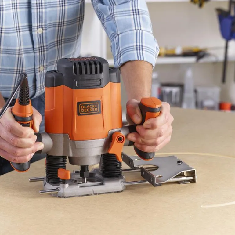 Black & Decker KW12000E-QS on 1200 W yläjyrsin, jonka nopeus on jopa 28000 kierr./min. Nopeudensäädin parantaa tarkkuutta. Moottorin kotelossa on tasainen yläosa, mikä helpottaa jyrsinterän vaihtoa. Varustettu karalukolla jyrsinterän nopeaa vaihtoa varten, turvakytkimellä ja ergonomisella sivukahvalla.