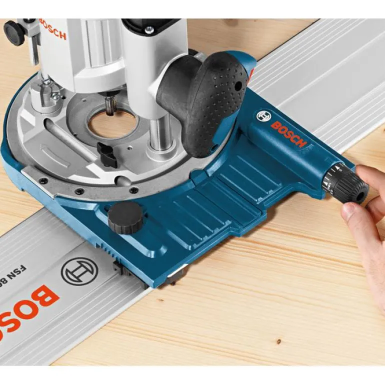 Käsiyläjyrsimen kiskoadapteri Boschin ohjainkiskoille FSN 800, FSN 1100, FSN 1600, FSN RA 32 800 ja FSN RA 32 1600. Jopa 25 mm:n suuntaissäätö. Jalkalevyn erilaiset reiät sopivat Bosch GOF/GMF -käsiyläjyrsimille sekä muille markkinoilla myydyille merkeille (esim. Festool, Mafell, DEWALT ja Makita).