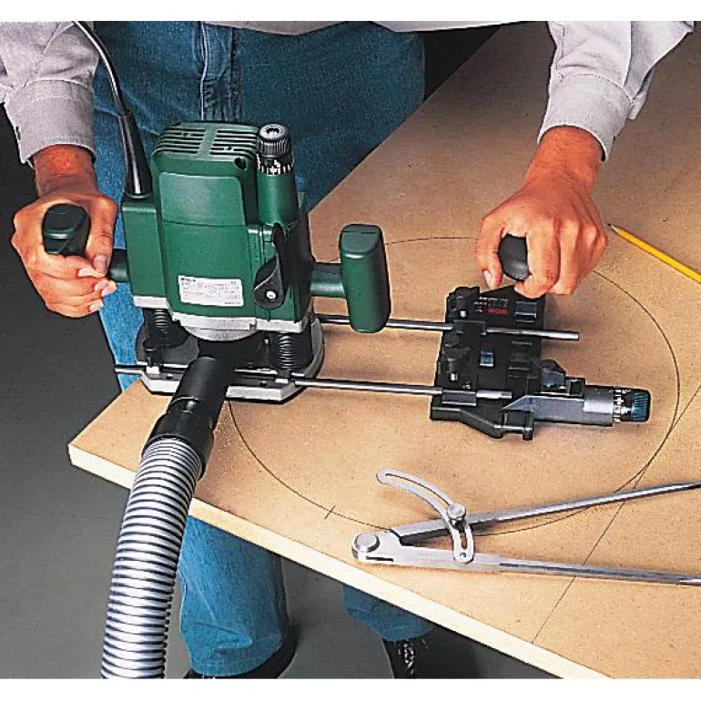 Ympyräohjain ja sovitin Boschin ohjainkiskoihin FSN 70 ja FSN 140. Ohjainkiskosovitin sopii Bosch-yläjyrsimiin.