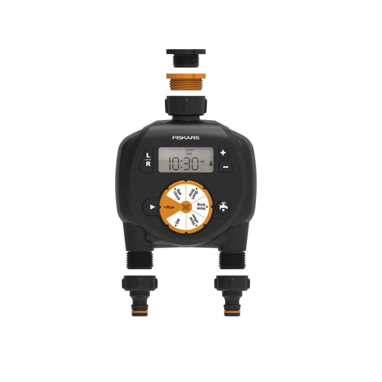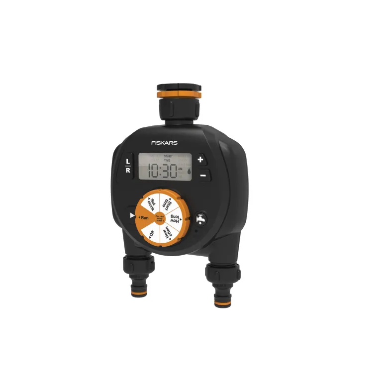 Aikaa ja vettä säästävä ajastin 2-suuntaisella liitoksella puutarhojen ja nurmikoiden kasteluun. Automaattinen veden virtaus päälle/pois päältä ohjelmoinnin mukaan.