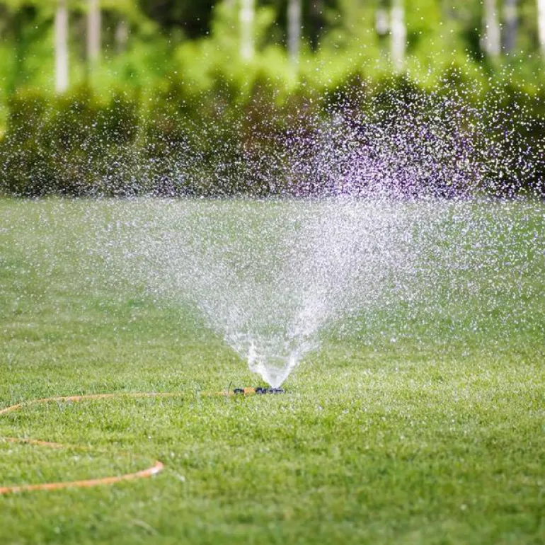 Ruostumaton metallisprinkleri, pyöreä. Vakiokytkin – sopii muiden valmistajien kanssa. Puutarhakoko S, 0-150 m2.