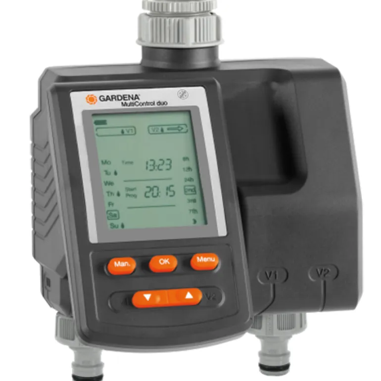 Toiminnot voidaan valita napinpainalluksella. Intuitiivisen toiminnan ja kastelutietojen vaiheittaisen näyttämisen ansiosta laite on helppokäyttöinen, ja kaikki tiedot esitetään selvästi suurella näytöllä. Kuhunkin liitäntään voidaan liittää vettä säästävä GARDENA-maankosteusanturi. Anturin älykäs toiminta keskeyttää tai estää automaattisesti kastelun, kun maaperä on riittävän kostea tai alkaa sataa. Molempia liitäntöjä voidaan ohjata myös anturilla. Oikealla ohjelmalla kastelu alkaa automaattisesti, kun maankosteusanturi havaitsee maan olevan kuiva. Kastelunohjain soveltuu hanoille, joiden kierteet ovat 26,5 mm (G 3/4) ja 33,3 mm (G1) ja käyttöpaine 0,5–12 baaria. Kastelunohjain toimii 9 voltin alkaliparistolla noin vuoden. Pariston varaustason näyttö ilmaisee, milloin paristo on vaihdettava. Paristo ei sisälly toimitukseen.