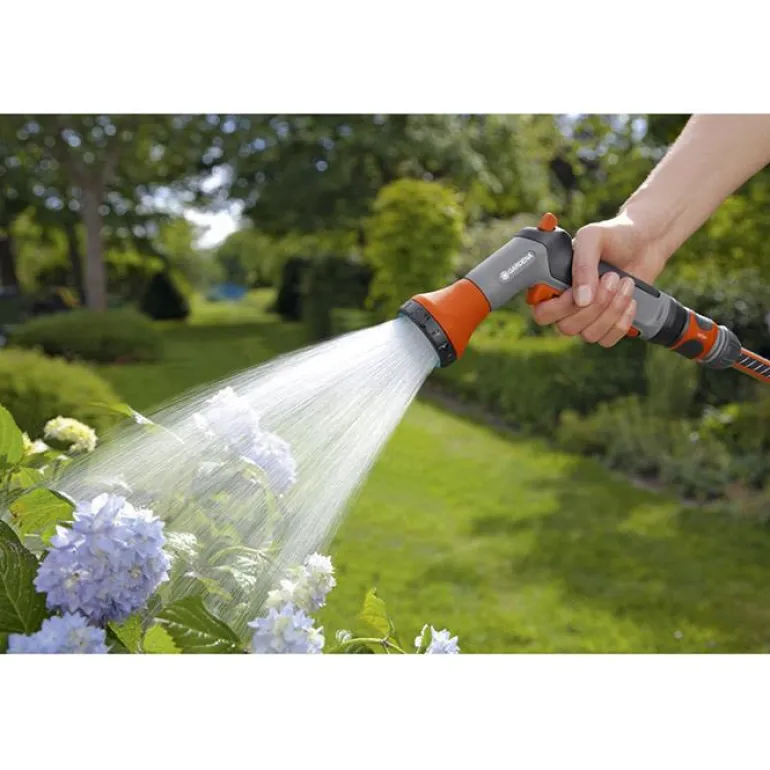 Gardena Classic kastelupistooli sopii erinomaisesti ruukkukasvien ja erillisten alueiden kasteluun. Integroitu, innovatiivinen jäätymisen kestävyys varmistaa, että kastelulaite säilyy ehjänä lämpötilan laskiessa. Virtausta voi säätää portaattomasti käyttötarkoituksen mukaan. Lukitus mahdollistaa jatkuvan kastelun vaivattomasti, koska liipaisinta ei tarvitse puristaa koko aikaa. Suuttimen pehmeä muovirengas suojaa vaurioilta.