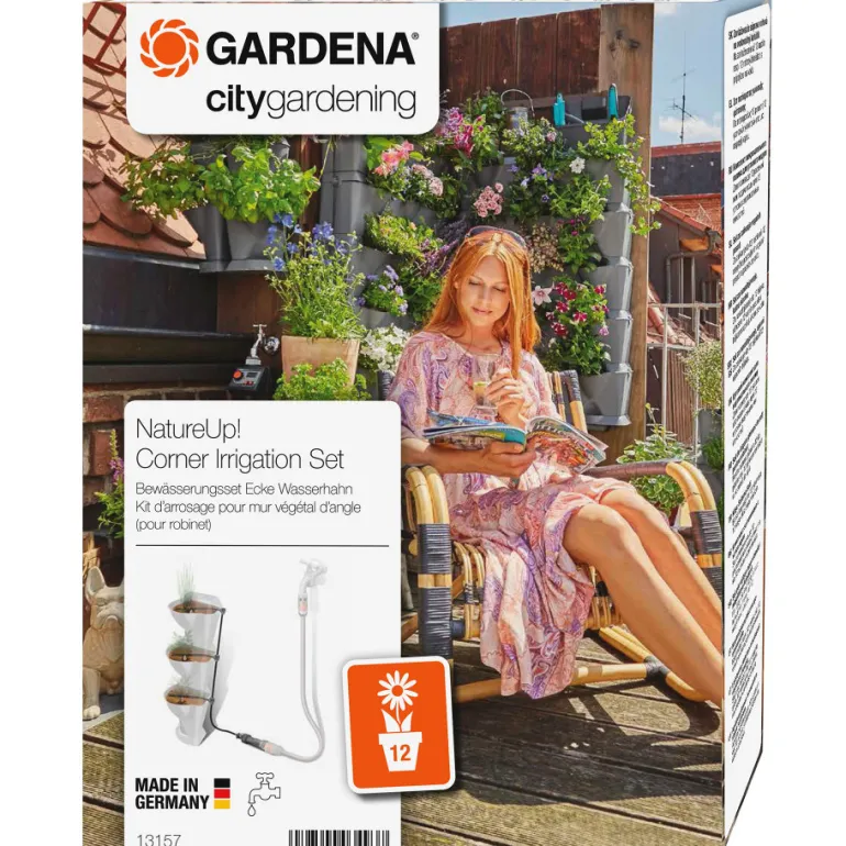 GARDENA Nature Up! on kastelusarja pystysuorille kulmakasvatuslaatikoille kätevään ja vettä säästävään kasteluun jopa 12 kasville. Pääyksikkö liitetään vesihanaan ja kasvit kastellaan tarkasti ohuilla tippukasteluletkuilla. Voidaan käyttää yhdessä GARDENA-kastelunohjaimen kanssa (ei mukana).