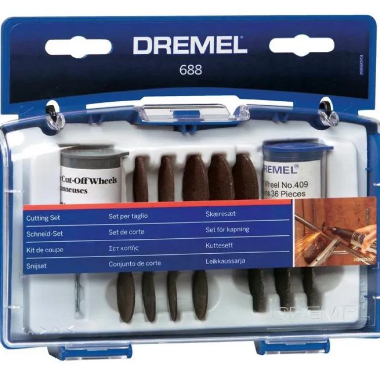 Katkaisusarja, joka sisältää 68 katkaisulaikkaa ja karan kätevässä laatikossa. Irrotettava lisätarvikelokero, jossa on kolme jakajaa kätevää säilytystä varten. Toimitetaan joustavassa säilytyslaukussa.