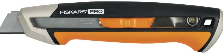 Fiskars CarbonMax katkoteräveitsi mukavalla terän vaihdolla edestä käsin ilman irrallisia osia helpottaa ja nopeuttaa terän vaihtoa. Sisäänrakennettu mekanismi helpottaa käytettyjen terien katkaisemista ja keräämistä, joten irtonaiset ja käytetyt terät eivät aiheuta huolta. Vahvistettu metallipää tarjoaa erittäin hyvän ja luotettavan suojan kolhuja ja putoamisia vastaan. Mukana 1 25mm CarbonMax-terä, joka säilyttää terävyyden 24 kertaa pidempään kuin tavalliset terät.