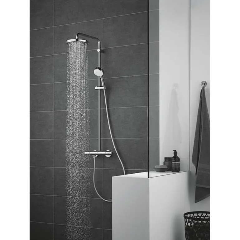 Kattosuihkusarja, jossa termostaatissa 150 mm cc-mitta ja seinäkiinnitys Sarjaan kuuluu sekä yläsuihku että käsisuihku ja lisäksi termostaattisekoitin. Osissa kromattu Grohe StarLight-pinta. Suihkusarjassa voi vaihtaa suihkutyyppejä ja siinä on SafeStop ja SafeStop Plus, jotka rajoittavat lämpötilan 38 tai 43 asteeseen.