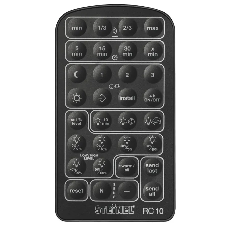 Kaukosäädin RC10 (E7501907) Steinel-tunnistinvalaisimen RS PRO LED Q1 käyttöönottoon ja asennukseen. Kaukosäätimellä voi asettaa valon kytkentäajan ja valaistuksen minimitason.