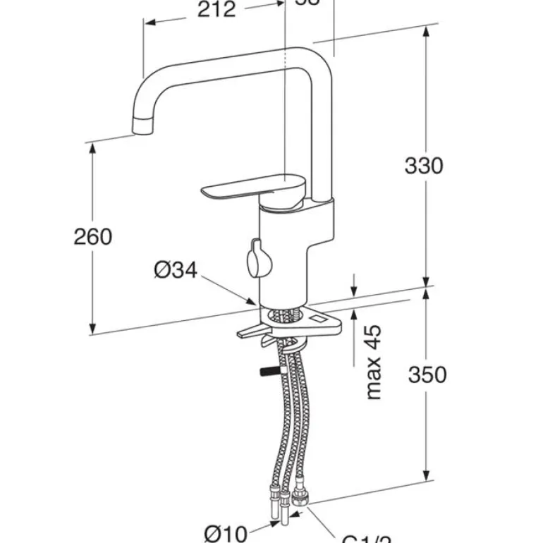 Keittiöhana, jossa on astianpesukoneliitäntä, keraaminen tiiviste ja korkea kääntyvä juoksuputki, jonka ulkonema on 212 mm.