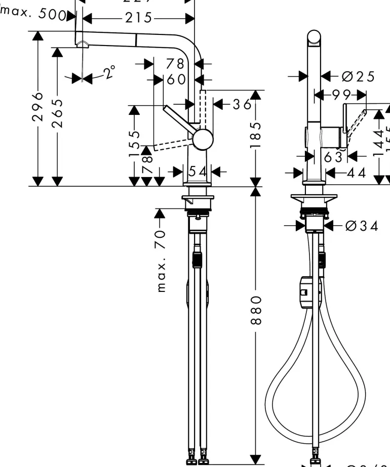 Yksivipuinen keittiöhana messinkiä. Ulosvedettävällä hanasuuttimella, 1 suihkumuoto. Keraaminen säätökasetti ja G ⅜ -letkuliitännät. Maksimivirtaama 3 bar: 8 l/min. Kääntösäde säädettävissä 4-portaisesti: 60°, 110°, 150° tai 360°.