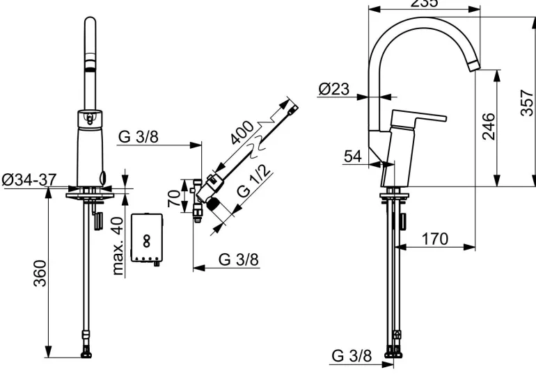 Keittiöhana, jossa on korkea, kääntyvä juoksuputki ja elektroninen pesukoneventtiili (kytketään kylmään veteen). Juoksuputken kääntymiskulma on 120° (mahdollista rajoittaa 0° tai 60°). Paristokäyttöinen 3 V. Automaattinen sammutus 4/12 h. Lämpötilan ja virtaaman rajoitusmahdollisuus. Oras ø 40 mm keraaminen säätöosa. Joustavat kytkentäputket.