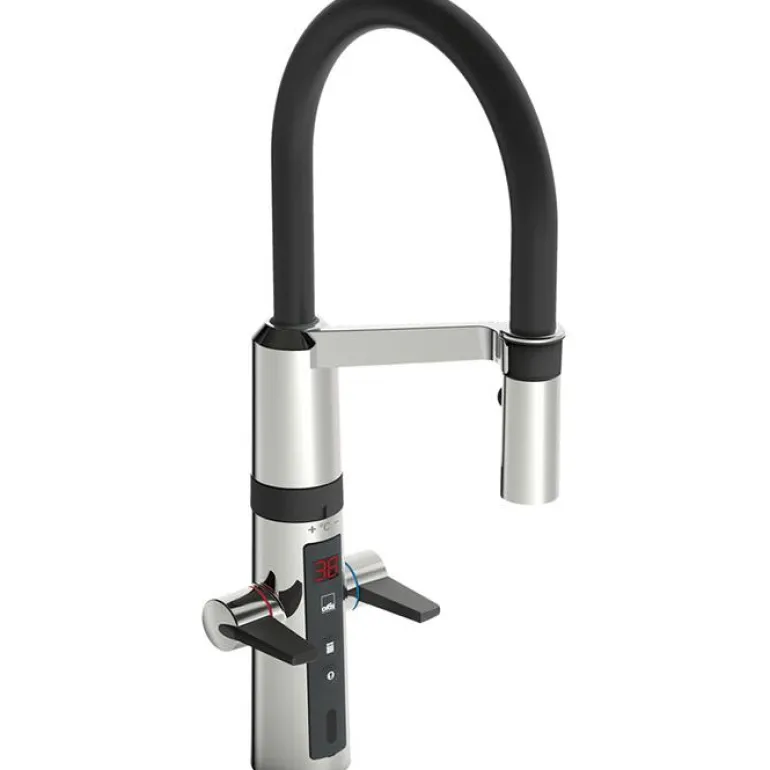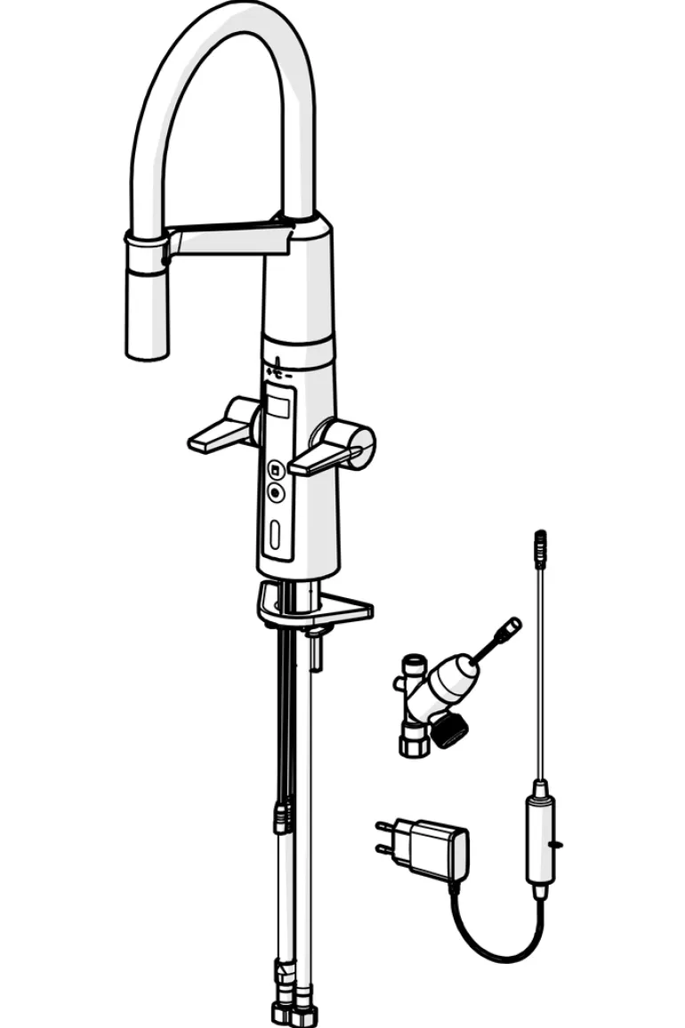 Kosketusvapaa toiminto avataan viemällä kädet tunnistusetäisyydelle, ja veden lämpötila säädetään kääntämällä hanan ja juoksuputken välissä olevaa säätörengasta. Kosketusvapaa toiminto on helppo ottaa käyttöön/pois käytöstä. Pesukoneventtiili avataan painonapista ja se sulkeutuu automaattisesti säädetyn ajan (4 tai 12 tunnin) jälkeen. Sähköliitäntä pistotulppamuuntajalla 230/5 V. Hanassa on roskasiivilät ja joustavat kytkentäputket.