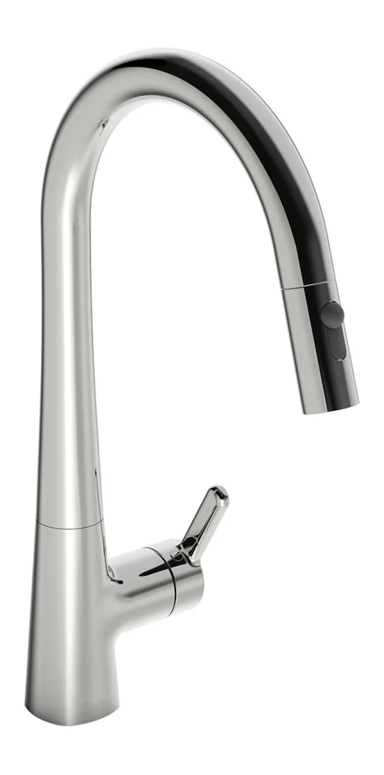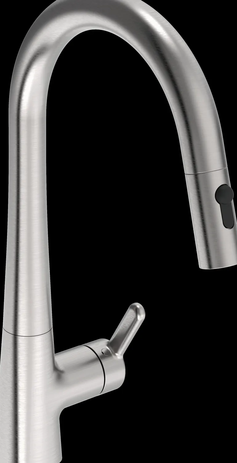 Keittiöhana, jossa sivuvipu sekä korkea, kääntyvä ja ulosvedettävä juoksuputki 120° (mahdollista rajoittaa 60°-0°). Juoksuputken pituus on säädettävissä. Joustavat kytkentäputket. Lämpötilan ja virtaaman rajoitusmahdollisuus. Harjattu teräs.