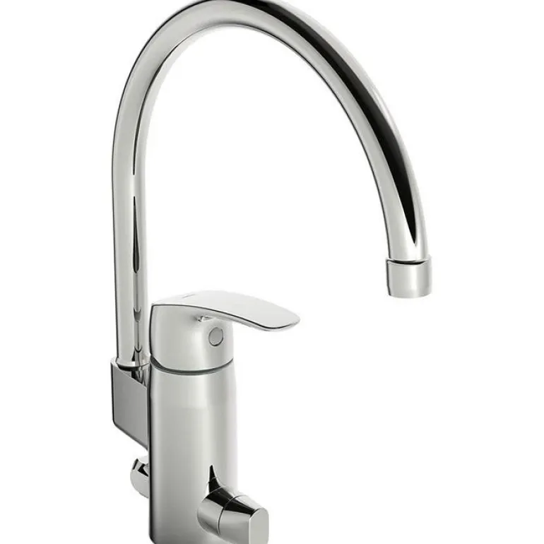 Keittiöhana, jossa on keraaminen astianpesukoneliitäntä ja korkea kääntyvä juoksuputki. Hanassa on lämpötilan ja virtauksen rajoitusmahdollisuus.
