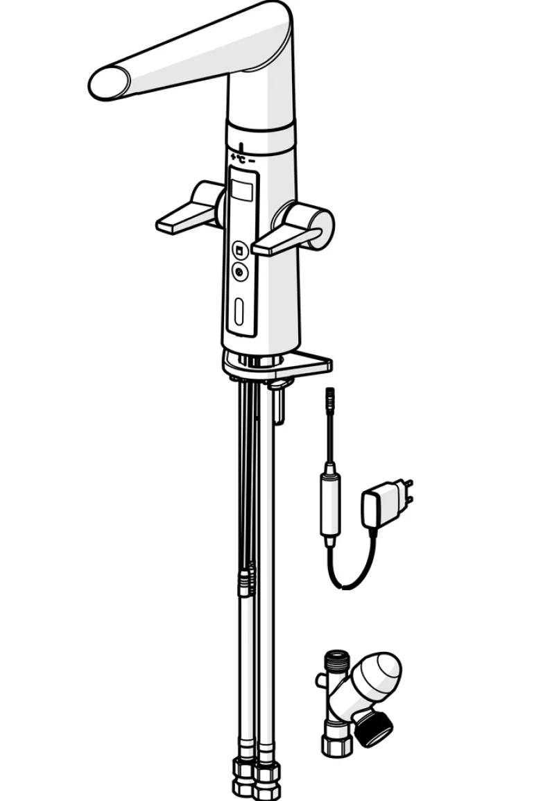 Kosketusvapaa toiminto avataan viemällä kädet tunnistusetäisyydelle. Kosketusvapaan toiminnon veden lämpötila säädetään kääntämällä hanan ja juoksuputken välissä olevaa säätörengasta. Kosketusvapaa toiminto on helppo ottaa käyttöön/pois käytöstä. Pesukoneventtiili avataan painonapista ja se sulkeutuu automaattisesti säädetyn ajan jälkeen. Pesukoneventtiili sulkeutuu automaattisesti neljän tai kahdentoista tunnin kuluttua (yhdellä painalluksella pesukoneventtiili on auki 4 tuntia ja viiden sekunnin painalluksella 12 tuntia). Sähköliitäntä pistotulppamuuntajalla 230/5 V.