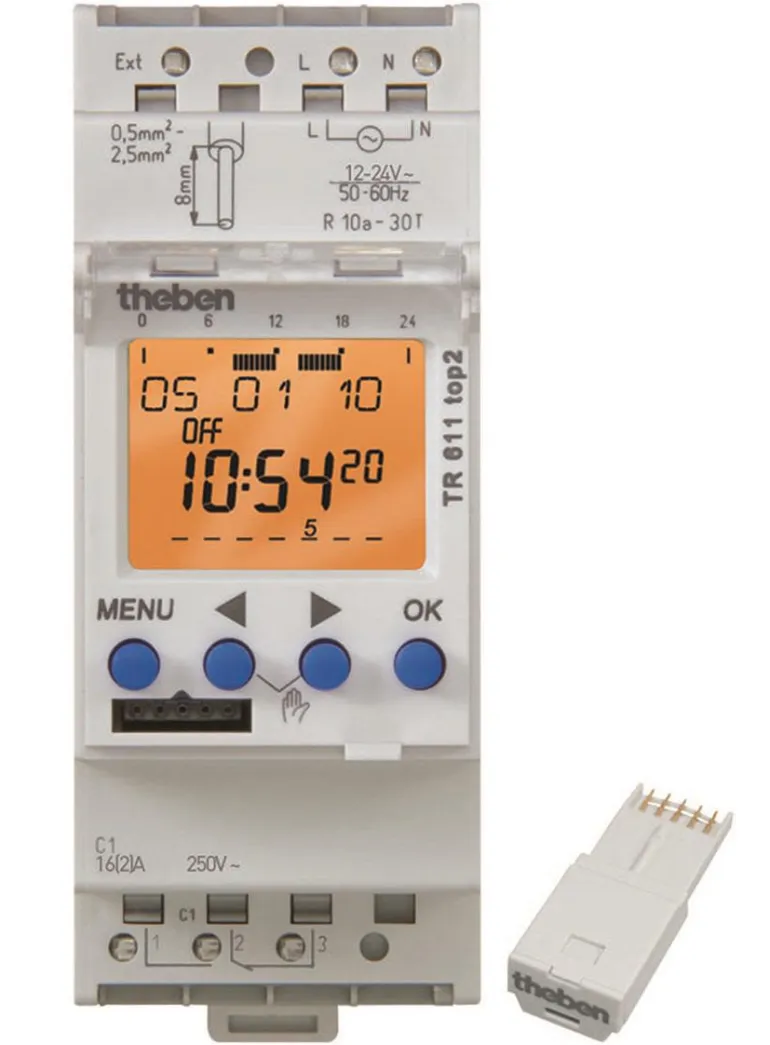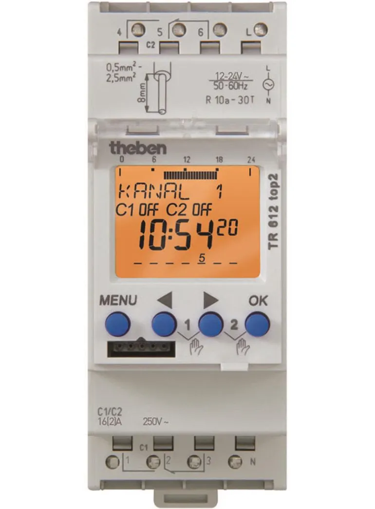 Thebenin digitaalinen kellokytkin asennettavaksi DIN-kiskoon. Saatavana 1 tai 2 kanavalla päivä- ja viikko-ohjelmilla. Looginen ja yksinkertainen tekstipohjainen ohjelmointi ja selkeät valikot. Theben-kellokytkimessä on automaattinen kesä-/ talviajan vaihto ja 10 vuoden varakäynti. Yksinkertainen ja turvallinen liitäntä jousiliittimillä, jokaiseen liitäntään voidaan liittää kaksi kaapelia. Top 2:ssa on nollapistekytkentä pidempää käyttöikää varten ja mahdollisuus suuremman kuorman liittämiseen.