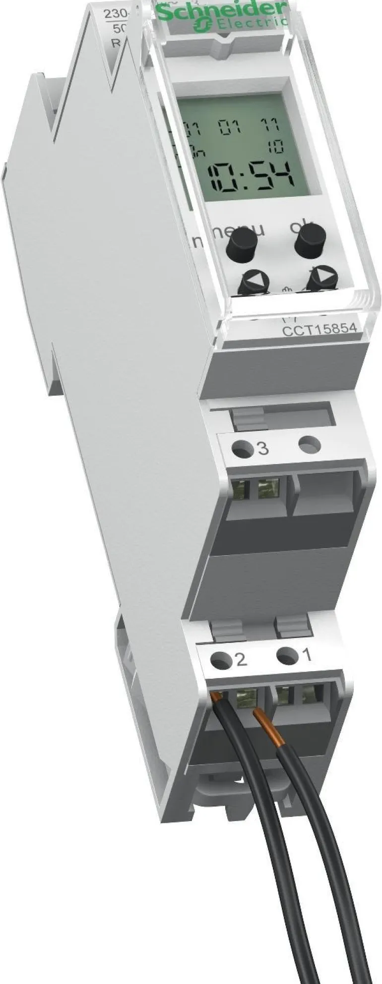 Schneider Electric CCT15854 Acti9 IHP -kellokytkin. 1 kanava ja 1 vaihtokosketin. 16 A, 18 mm.