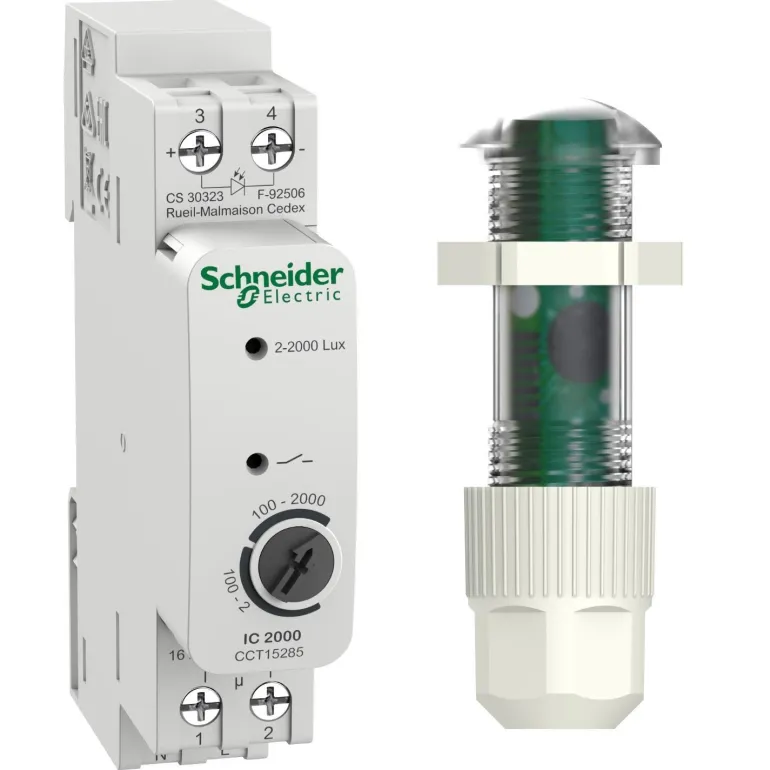 Schneider Electric Acti9 IC2000d -hämäräkytkin. 2-2000 lx, 230 V AC, 16 A, valosensorilla sisäkäyttöön. Varaosana sopivat valotunnistimet CCT15262 ja CCT15263.