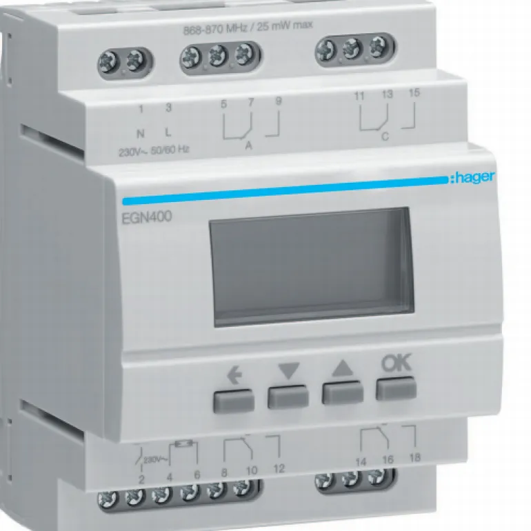 Digitaalinen 4-kanavainen kellokytkin, joka otetaan käyttöön suoraan edessä olevilla painikkeilla tai bluetoothin kautta Hager Mood -sovelluksella. Kellokytkimessä on myös integroitu QuickLink-radio esimerkiksi langattomien Lux anturien liittämiseen.