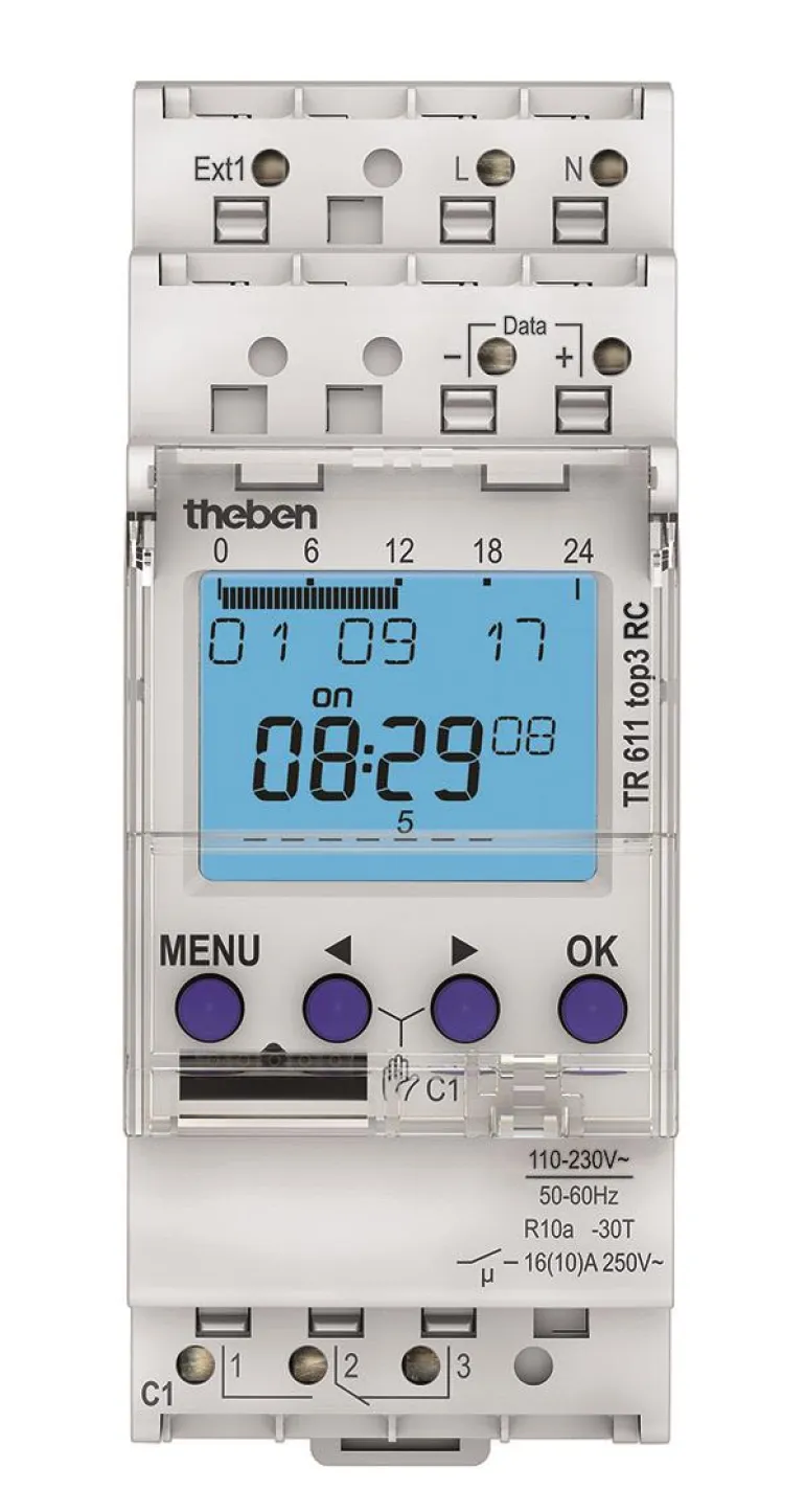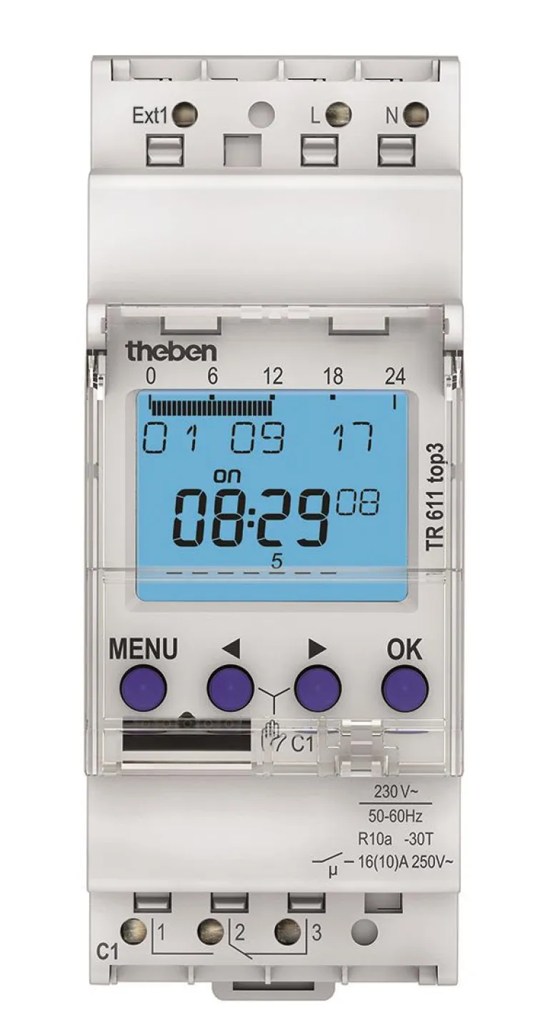 Digitaalinen kellokytkin TR 611 top 3 viikko-ohjelmalla, 1 kanavalla ja 3 erikoisohjelmalla. Pieni vuosiohjelma ja 1 ulkoinen tulo. Digitaalinen kellokytkin 1 kanavalla.