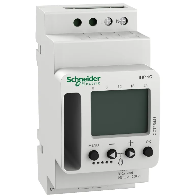 Schneider Electric CCT15441 Acti9 IHP -kellokytkin digitaalinen. Viikkokellotoiminto 1:lle vaihtokoskettimelle. Nimelliskytkentävirta 250 V AC: 16 A.