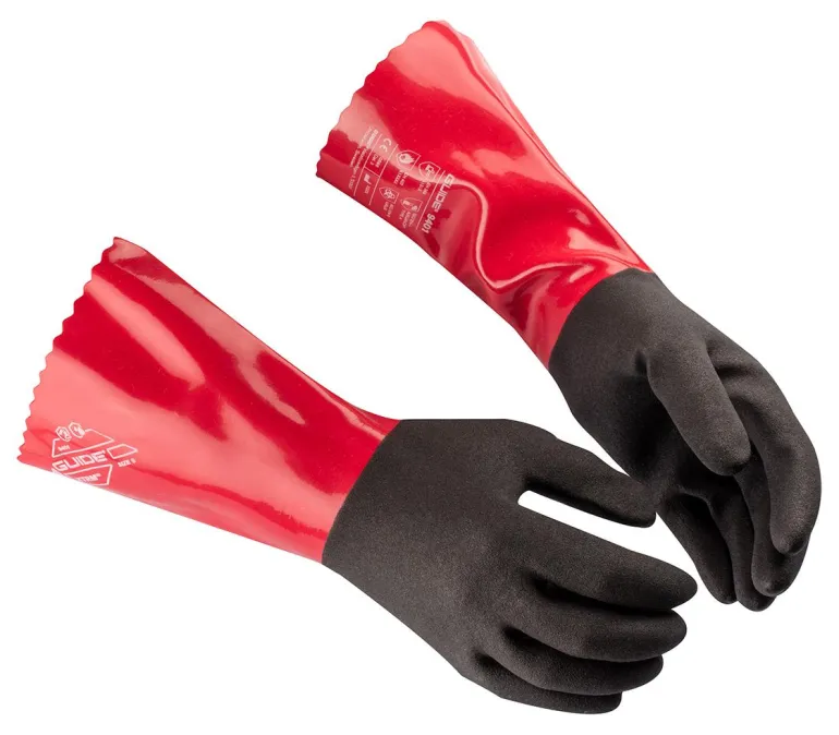 Guide Gloves 9401 on lujaat kemikaaleja kestävät käsineet kaikenlaisiin töihin, joissa vaaditaan suojausta kemikaaleja vastaan. Kastetut kaksikerroksiseen, nestettä kestävään NBR- ja PVC-seokseen. 15-gauge polyesterista ja puuvillasta valmistettu vuori tarjoaa mukavan ratkaisun ja takaa erinomaisen sormituntuman. Tyyppi A kemikaalisuoja. Mikrobiologinen ja virussuoja sekä neste- ja kemikaalivuotojen estävä este. Kosketuslämpösuojaus taso 1 (100 °C, EN 407).
