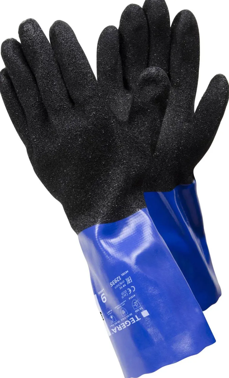 Tegera 12935 on tuplapinnoitettu PVC-kemikaalisuojakäsine, jossa on keskipitkä ranneke. Soveltuu raskaampiin töihin.