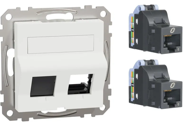 Kulmamallin valkoinen keskiölevy Exxact-sarjan datapistorasialle 2x Actassi UTP S-One DPM modulaarisella liittimellä. Asennus liitäntärasiaan cc 60 mm tai pinta-asennettuna rasiaan vähintään 33 mm Cat 6 UTP: lle ja mieluiten 47 mm STP: lle. Säädettävä kolmisivuinen tyyppikilpi; tyhjä, teksti ja värikoodaus. Täydennetään Exxact-kehyksellä.
